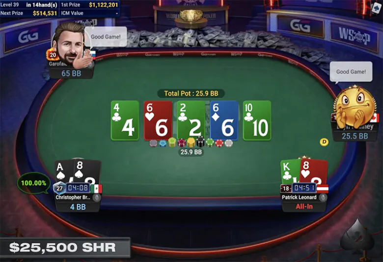 In heads-up play, Francesco Garofalo faced Chris Brewer with a stack advantage of 64 big blinds vs. 56 big blinds. Garofalo maintained the lead until the final hand. The effective stack is 25bb. Garofalo opens, Brewer defends the BB. They both check on the flop. On the turn, Garofalo bets 5.5bb into a 4.2bb pot and gets called. On the river, Garofalo put Brewer all-in.