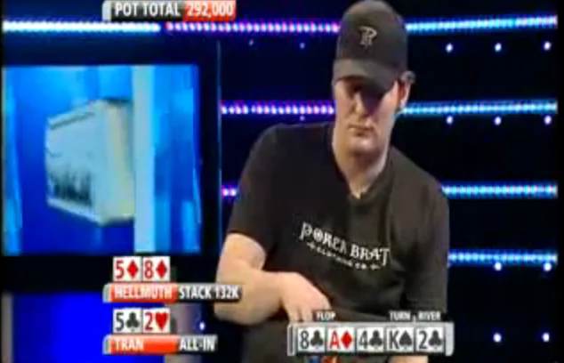 Tran puts Hellmuth all-in and sends him into the tank. Hellmuth eventually decides to call with third pair and wins a huge pot.