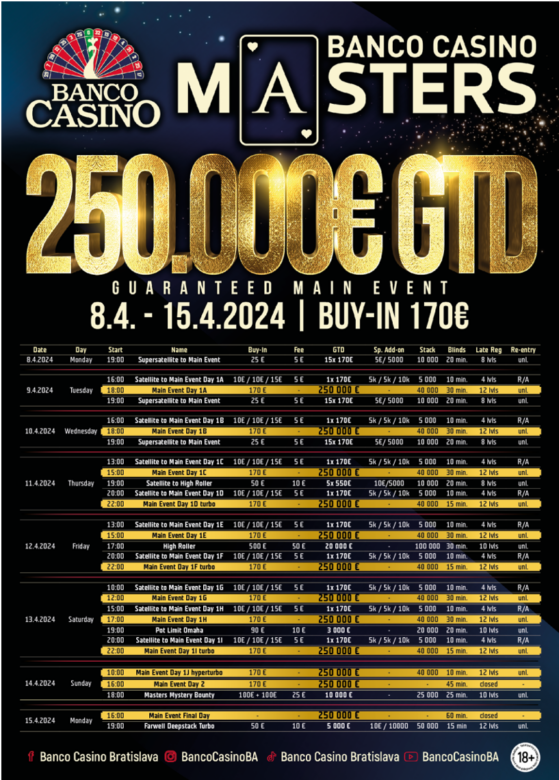 From April 8th to April 15th, the Banco Casino Bratislava buzzed with anticipation as players gather to test their skills on the felt. With the promise of massive winnings for the top spots, and the coveted title of Banco Masters champion on the line, the atmosphere will once again be full with energy and determination.