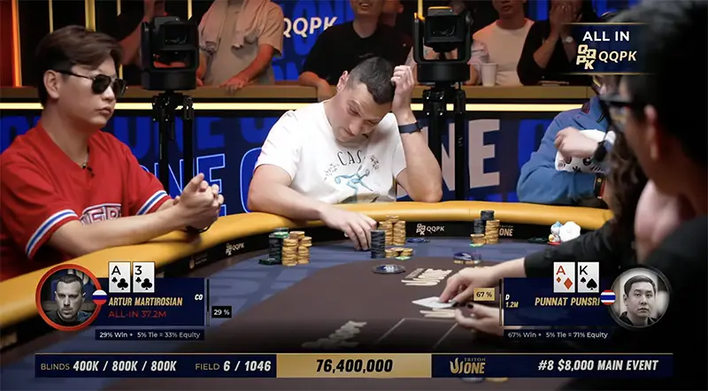 At the very beginning of the final day, Artur Martirosian showed incredible survival skills. At one point, he was down to 4 BB but managed to win several all-ins. Ultimately, in his last hand, Martirosian 6-bet shoved for 46.5 BB preflop with A3s, and Punsri called with AKo.