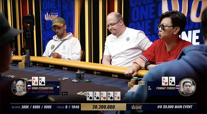 Sergei Petrushevskii finished in 9th place. In the very first hand of the final table with an effective stack of 23.5 BB, Petrushevskii picked up AKo while Punsri had AA. Petrushevskii 3-bet preflop, Punsri called. The flop came K53 — there was no way the Russian could escape this one.